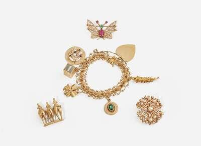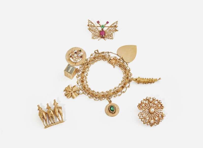A collection of 14K yellow gold jewelry, including a floral brooch also functioning as a pendant set throughout with round white pearls, a 14K yellow gold charm bracelet with various gem-set charms, a 14K yellow gold brooch designed as a butterfly and set with pink topaz, pink tourmaline, and a round-cut emerald, and a 14K yellow gold brooch depicting three hunters on horses viewed from behind.