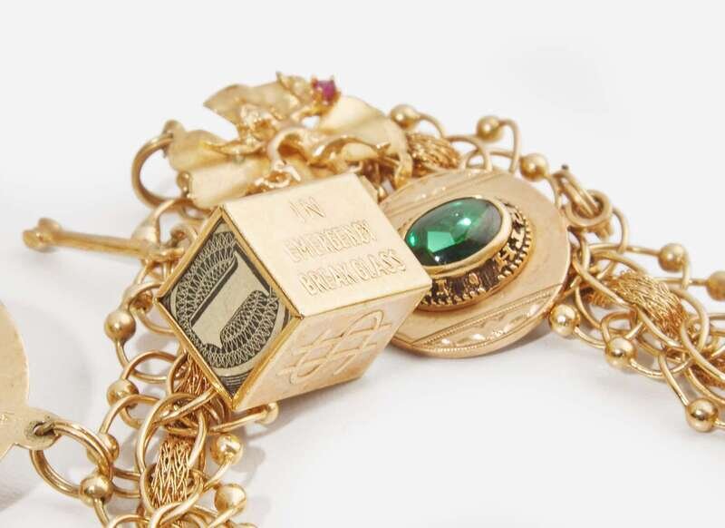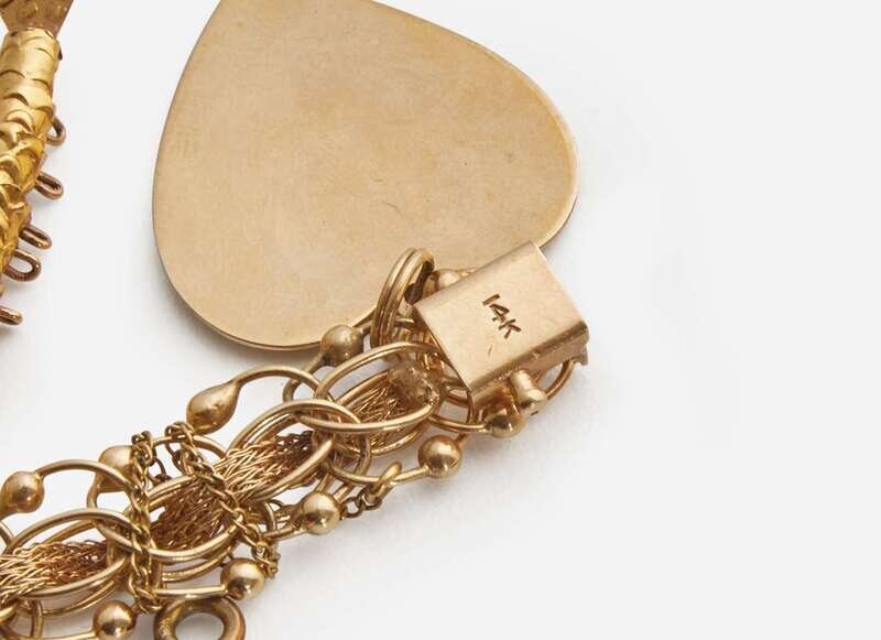 Bracelet: Light scratches and wear, bracelet stamped “14K”, box clasp and figure-eight safety latch in working order, with a 14K yellow gold heart-shaped charm, an articulated fish charm set with a round-cut red glass stone, a Herff Jones 10K yellow gold charm with an oval-cut green stone, a 14K yellow gold fairy charm with a round-cut pink stone, a money box charm, and a 14K yellow gold tree charm set with round blue, red, green, purple, and white stones, safety chain intact, safety chain clasp in working order.