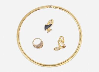 A two-tone 14K gold necklace, white gold on one side and yellow gold on the reverse, with a 10K yellow gold slider charm set with baguette-cut diamonds, a 14K yellow gold slider charm set with a smooth carved onyx and round brilliant-cut diamonds, and a sterling silver ring set with small diamonds. Diamonds are near colorless (G – J), with SI – I clarity. Total estimated weight of diamonds: 0.32 carats.