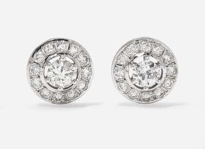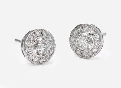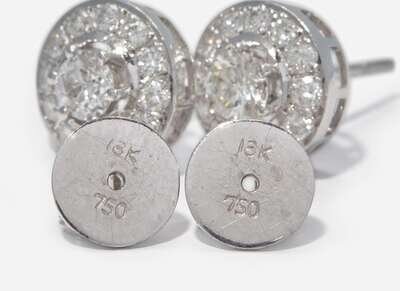 A pair of 18K white gold studs designed to center a round brilliant-cut diamond weighing approximately 0.35 carats, surrounded by a halo of round brilliant-cut accent diamonds. Diamonds are near colorless (G - J), with SI - I clarity. Total estimated weight of diamonds: 1.42 carats.