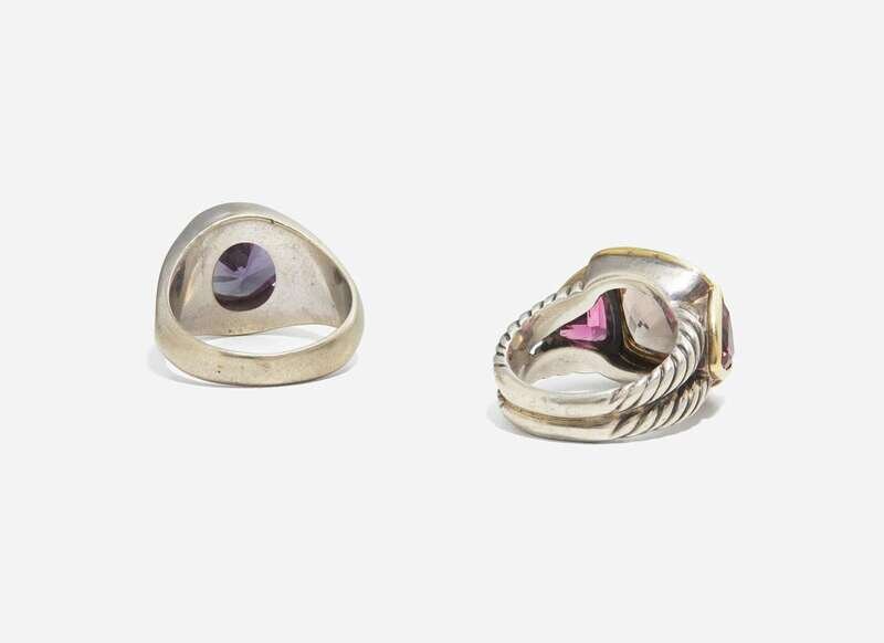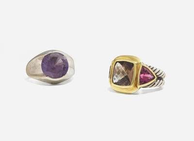 A pair of rings, including a sterling silver and 18K yellow gold ring by David Yurman, featuring a faceted square-cut smoky Quartz bezel-set in yellow gold, flanked by two triangular-cut tourmalines leading down a rope-like textured sterling silver shank, and a 10K white gold ring set with a prominent round-cut color-change synthetic sapphire.