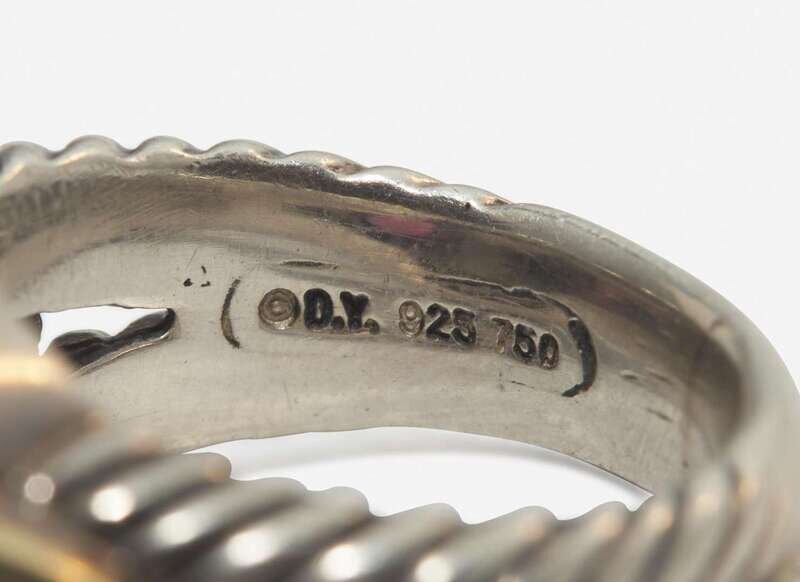 David Yurman Ring: Some scratches and wear, stamped “D.Y. 925 750”, set with a square-cut faceted smoky quartz measuring approximately 10.66mm x 10.66mm, and two triangular-cut tourmalines each measuring approximately 8.18mm.