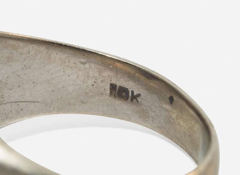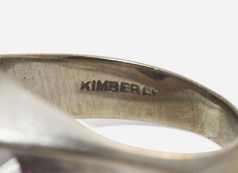 Sapphire Ring: Significant scratches and wear, stamped “KIMBERLY 10K”, set with a round-cut color-change synthetic purple and blue sapphire measuring approximately 12.34mm, with some abrasions and nicks at facet junctions.