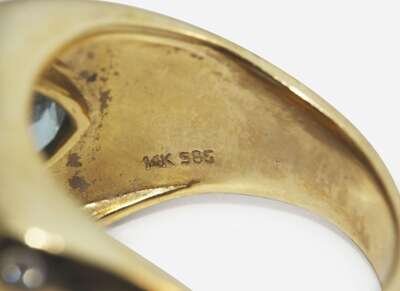 Chunky Multi-Color Ring: Size 6 ½, light scratches and wear, stamped “14K 585” with maker’s mark, set with two pear-shape blue topaz each measuring approximately 5.76mm x 5.53mm, a round-cut garnet measuring approximately 5.32mm, an oval-cut amethyst measuring approximately 5.08mm x 6.68mm, a pear-shape citrine measuring approximately 5.60mm x 7.86mm, a pear-shape peridot measuring approximately 5.64mm x 7.73mm, and eight round brilliant-cut diamonds each measuring approximately 1.50mm, near colorless (G – J), with SI – I clarity. Total estimated weight of diamonds: 0.12 carats.