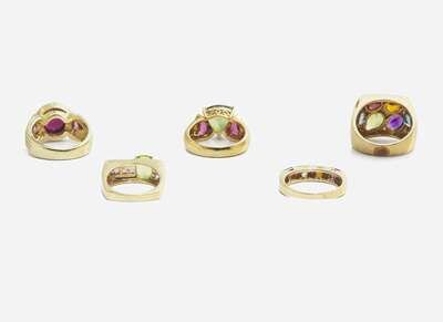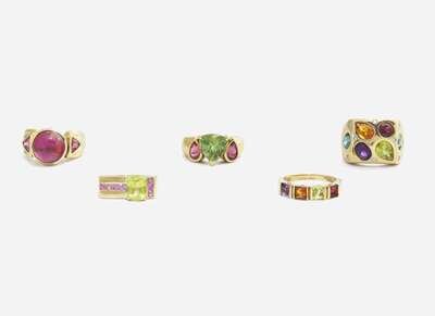 A collection of ladies yellow gold and gemstone rings, including a 14K yellow gold band set with square-cut peridot, citrine, amethyst, and garnet, a 14K yellow gold ring featuring a round cabochon amethyst with triangular-cut amethyst accents, a 14K yellow gold ring set with variously-shaped blue topaz, garnet, amethyst, citrine, peridot, and diamonds, a 14K yellow gold rectangular-topped ring set with an oval cushion-cut peridot and channel-set round-cut rubies, and an 18K yellow gold three-stone ring set with a triangular-cut peridot and two pear-shaped amethyst.