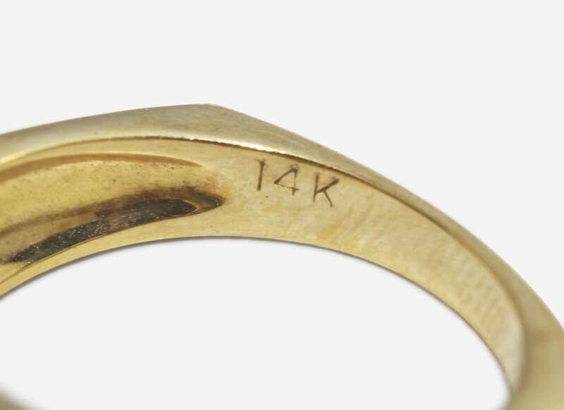 Cabochon Ring: Size 7, some scratches and wear, stamped “14K” partially rubbed away, set with two triangular-cut amethyst each measuring approximately 4.89mm, and one round cabochon amethyst measuring approximately 11.36mm.