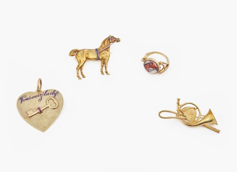 An assorted collection of yellow gold jewelry, including an engraved heart-shaped pendant depicting a key set with three square faceted-cut rubies under the words “Vous avez la clef”, an 18K yellow gold brooch designed as a French horn with a riding cap, a 14K yellow gold ring featuring a bezel-set Essex crystal depicting a horse, and a 14K yellow gold brooch designed as a horse set with square faceted-cut sapphires, a round-cut ruby, and a single-cut diamond.