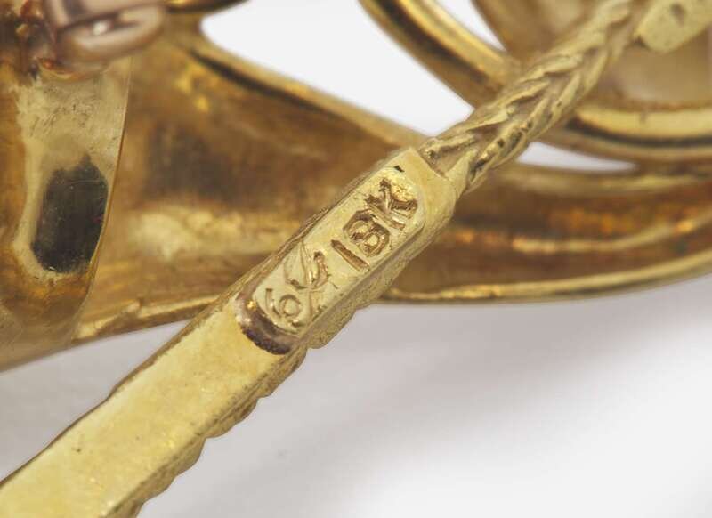 French Horn Brooch: Measures approximately 2in x 1in, stamped “18K” with maker’s mark, clasp in working order.