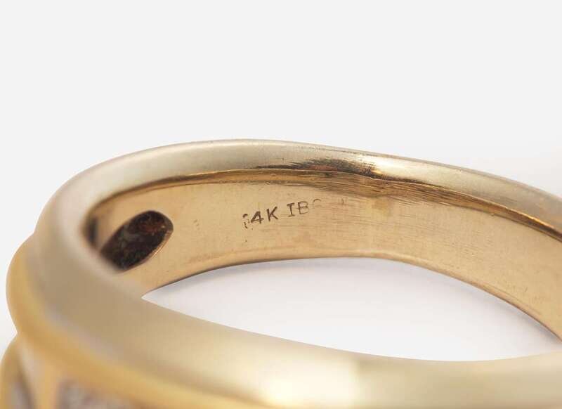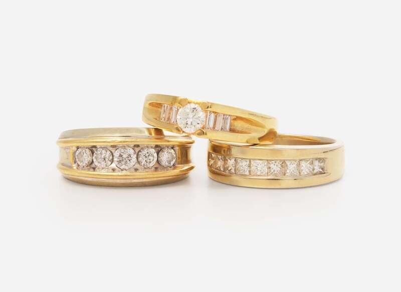 A group of three men’s rings, including a 14K yellow gold ring channel-set with princess-cut diamonds, a two-tone 14K yellow and white gold ring set with round brilliant-cut diamonds, and a 14K yellow gold ring set with a round brilliant-cut diamond flanked by straight baguette-cut diamonds. Diamonds are near colorless (G – J), with SI – I clarity. Total estimated weight of diamonds: 3.37 carats.