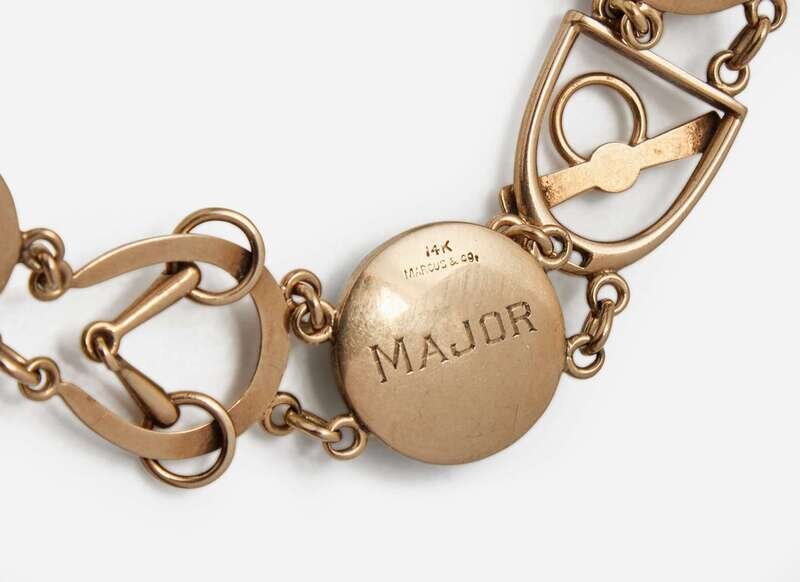 Three-Crystal Bracelet: Measures approximately 8in long, minor scratches and wear, clasps in working order, safety chain intact, stamped “14K MARCUS & CO.” and engraved “MAJOR”.
