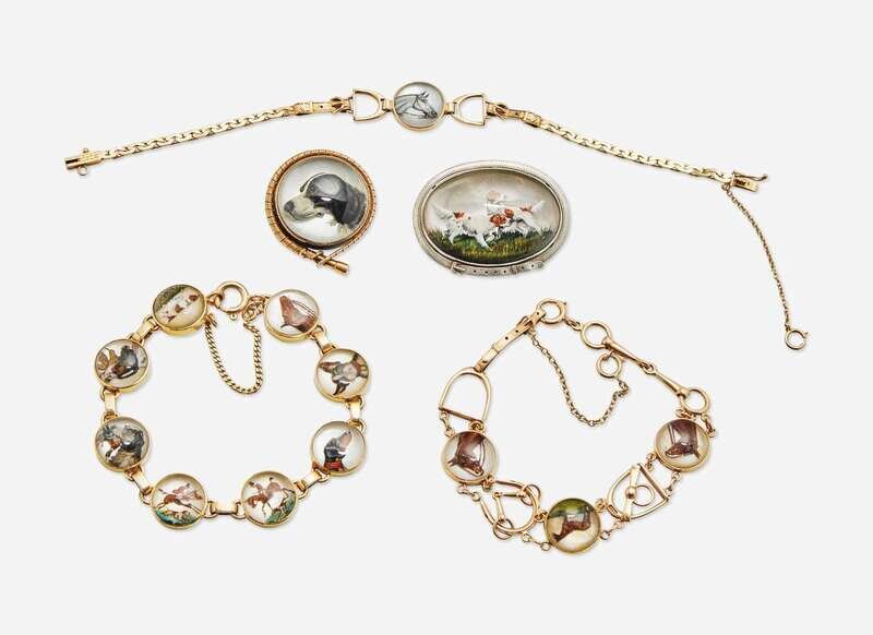 A group of Essex crystal jewelry, including a 14K yellow gold bracelet comprised of three round Essex crystals depicting horse-riding motifs separated by fancy links of yellow gold depicting bridle bits, a 14K yellow gold C-link bracelet with a central Essex crystal depicting a horse’s head flanked by stirrups, a 14K yellow gold bracelet featuring eight Essex crystals depicting hunting scenes, spaced by gold links, a 14K white gold brooch with yellow gold backing featuring an oval Essex crystal depicting two dogs, and a 14K yellow gold brooch featuring a round Essex crystal depicting a dog’s head surrounded by a textured gold horse’s whip.
