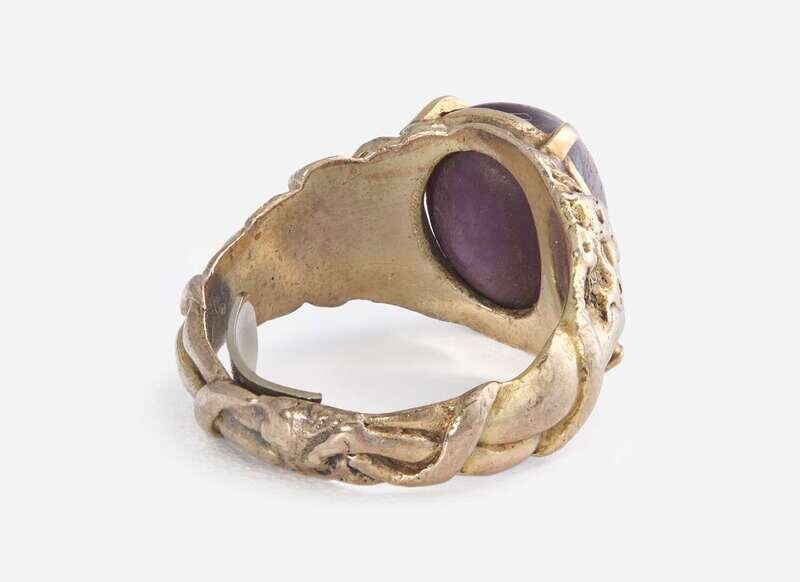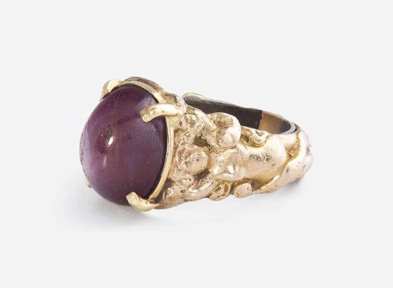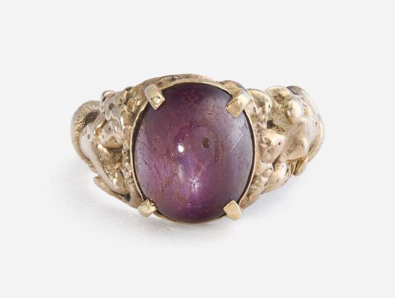 A men's 10K yellow gold ring with a decorated band depicting two mermaids, one on either side of the central oval cabochon star ruby measuring approximately 10.85mm x 12.96mm.