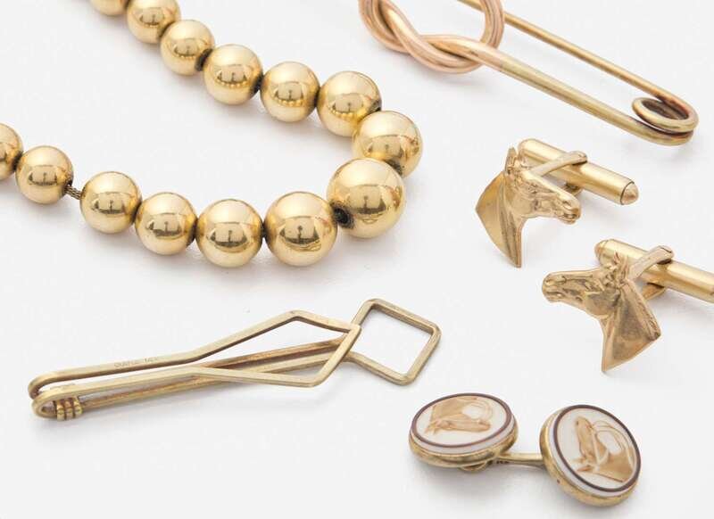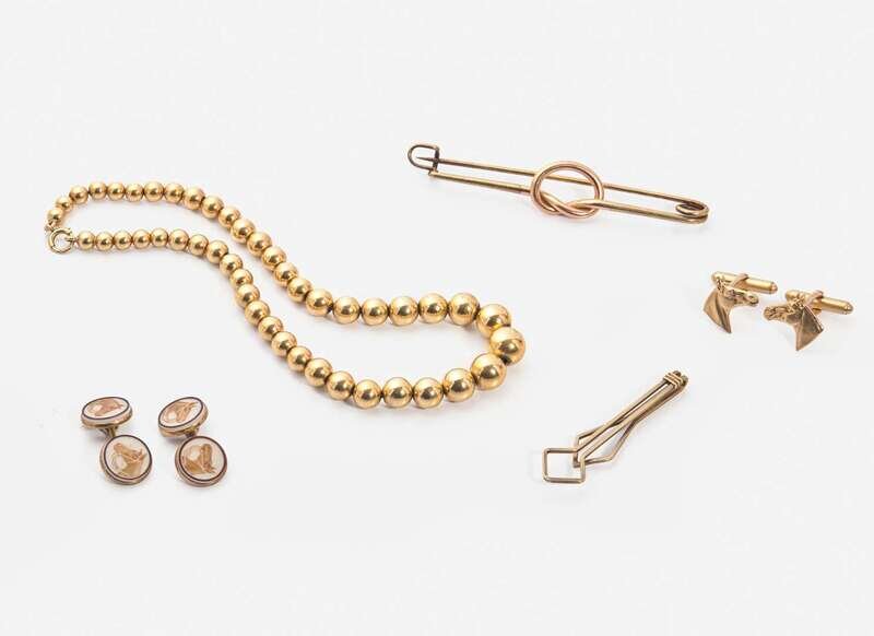 Overall Condition: Scratches and wear to all pieces, all jewelry marked as 14K gold, all clasps in working order.