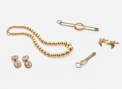 A collection of assorted 14K yellow gold jewelry, including a graduated bead necklaces, two pairs of cufflinks depicting horses, a tie bar, and a yellow and rose gold bar pin designed as a thick knot.