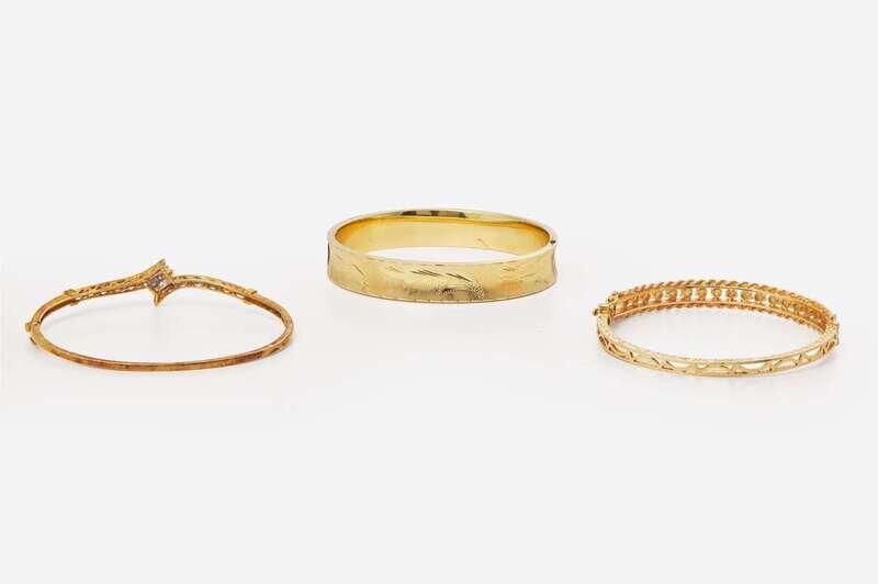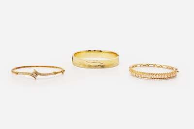 A collection of three yellow gold bangle bracelets, including a 14K yellow gold bracelet featuring delicately etched foliage designs, a 14K yellow gold bracelet set with a row of round white pearls flanked by a twisted rope texture on the top with an engraved openwork texture on the bottom, and a 10K yellow gold bracelet set with baguette-cut and round brilliant-cut diamonds. Diamonds are near colorless (G – J), with SI – I clarity. Total estimated weight of diamonds: 0.25 carats.