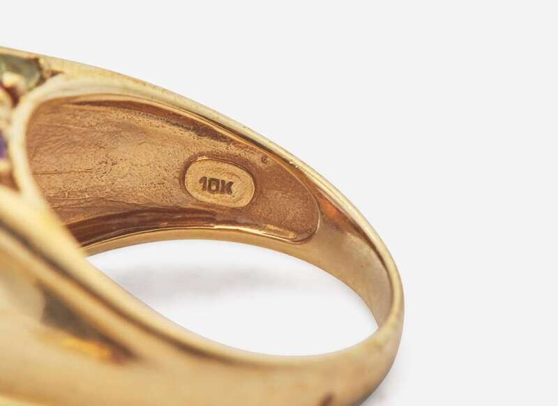 Multi-Color Gemstone Ring: Size 6, stamped “10K ATR”, set with a faceted amethyst measuring approximately 11.95mm, and variously-shaped citrine, amethyst, emerald, garnet, and aquamarine at the base of the head.
