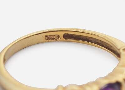 Oval-Cut Ring: Size 6, stamped “14K”, set with two oval-cut amethyst each measuring approximately 4.39mm x 7.00mm and one oval-cut amethyst measuring approximately 8.00mm x 10.00mm.