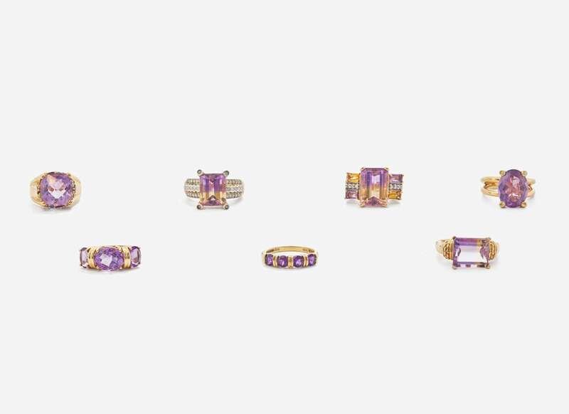 A collection of ladies yellow gold and amethyst rings, including a 10K gold ring set with an emerald-cut amethyst and round brilliant-cut accent diamonds, a 14K gold ring set with a color-zoned purple and yellow emerald-cut amethyst, a 14K yellow gold emerald-cut amethyst ring with round brilliant-cut diamond accents, a 14K yellow gold ring set with a single oval-cut amethyst, a 14K yellow gold ring set with four round-cut amethysts, a 10K yellow gold ring set with a faceted amethyst and variously-shaped citrine, amethyst, emerald, garnet, and aquamarine accents, and a 14K yellow gold ring set with oval-cut amethysts.