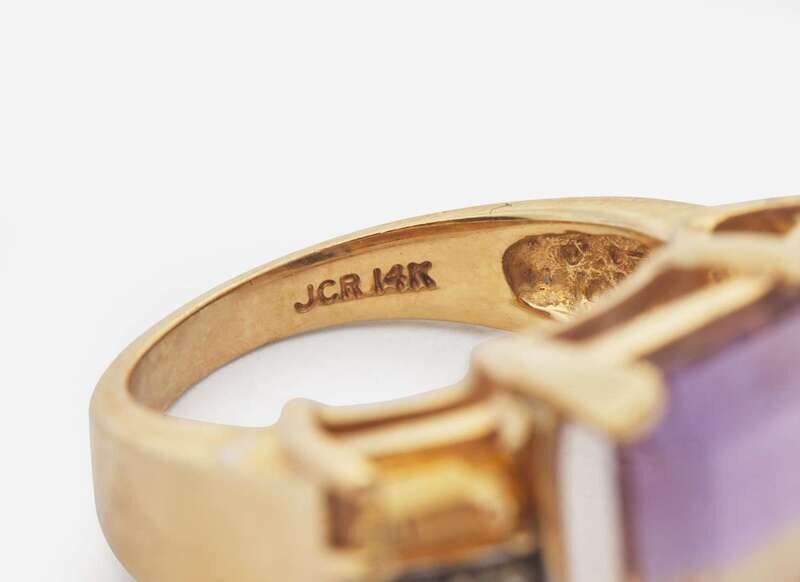 14K Emerald-Cut Ring with Diamonds: Size 5, stamped “JCR 14K”, set with two emerald-cut citrine each measuring approximately 3.15mm x 5.00mm, two emerald-cut amethyst each measuring approximately 3.15mm x 5.00mm, one color-zoned purple and yellow emerald-cut amethyst measuring approximately 10.00mm x 14.00mm, and six round brilliant-cut diamonds each measuring approximately 0.94mm, too small to grade. Total estimated weight of diamonds: 0.02 carat.