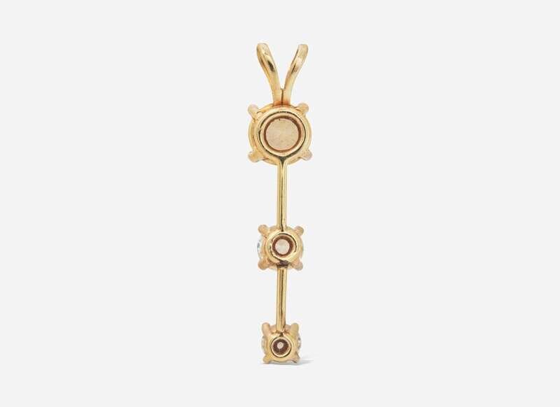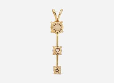 A three-stone diamond pendant, crafted from 14K yellow gold as a row of round brilliant-cut diamonds, faint to light yellow color (L – O), with SI – I clarity. Total estimated weight of diamonds: 1.60 carats.