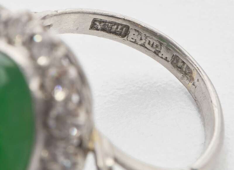 Ring: Light scratches, wear, and some discoloration to metal, stamped “18K”, set with a round jade stone measuring approximately 12.86mm.