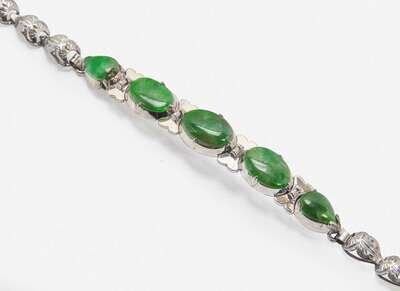 Bracelet: Minor scratches and wear to metal, stamped “18K”, clasp in working order, set with two pear-shape jade each measuring approximately 6.25mm x 9.38mm, two oval-cut jade each measuring approximately 7.00mm x 10.10mm, and one oval-cut jade measuring approximately 7.70mm x 11.20mm.