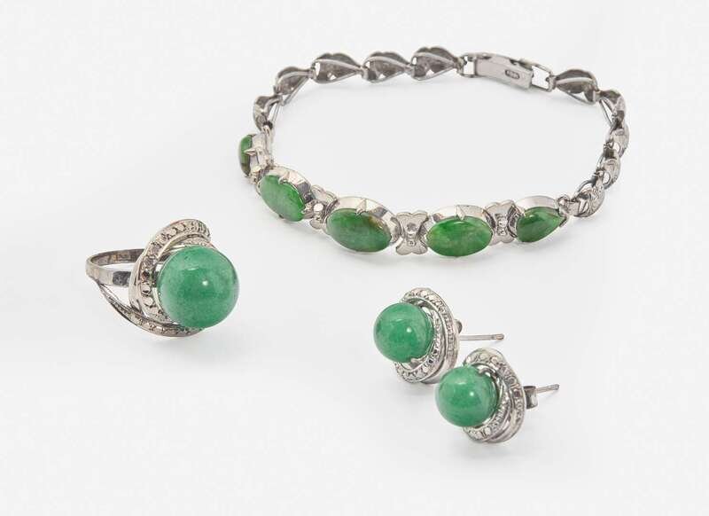 A three-piece 18K white gold and jade jewelry suite, including a ring set with a round jade stone in a swirling white gold setting, matching stud earrings suitable for pierced ears on stud posts with butterfly earring backs, and a bracelet designed with textured engraved links and set with pear-shape and oval smooth jade stones.