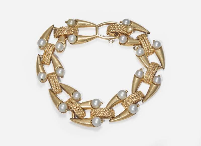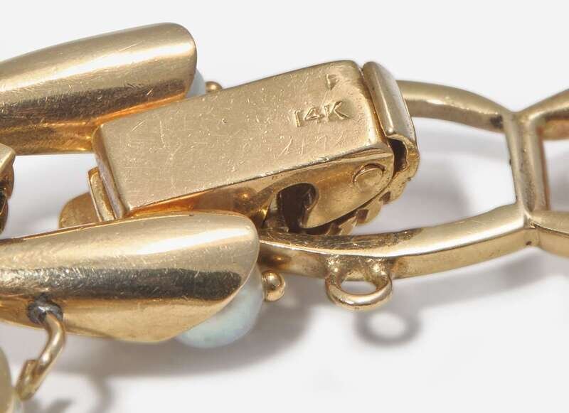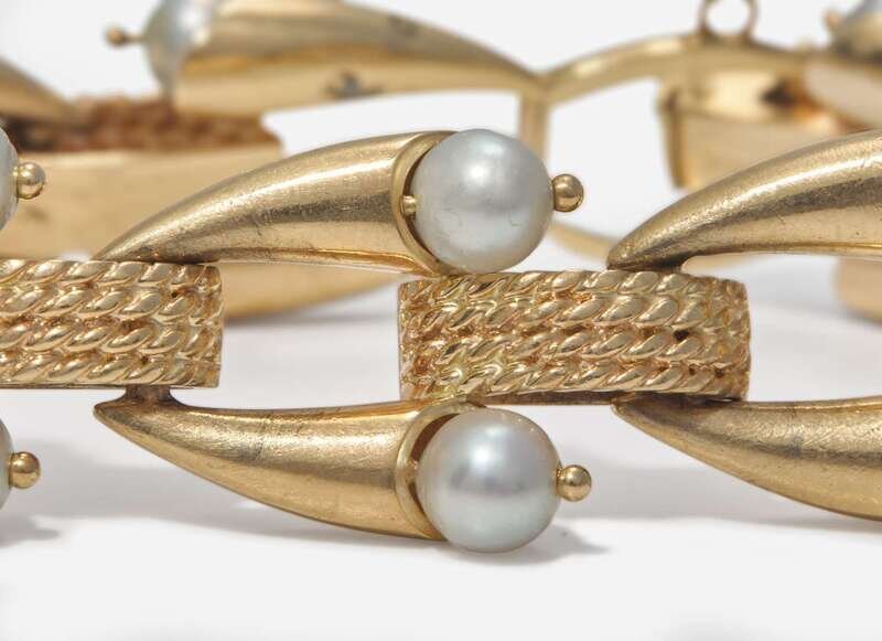 A 14K yellow gold bracelet, designed as sections of smooth gold accented by silvery round pearls each measuring approximately 5.15mm each separated by links designed as rows of twisted rope.