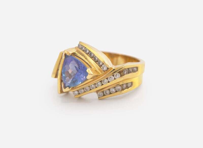 Ring: Light scratches and wear, stamped “18K LEVIAN”, set with a triangular-cut tanzanite measuring approximately 7.10mm, and thirty-four round brilliant-cut diamonds each measuring approximately 1.30mm, near colorless (G – J), with SI – I clarity. Total estimated weight of diamonds: 0.34 carats.