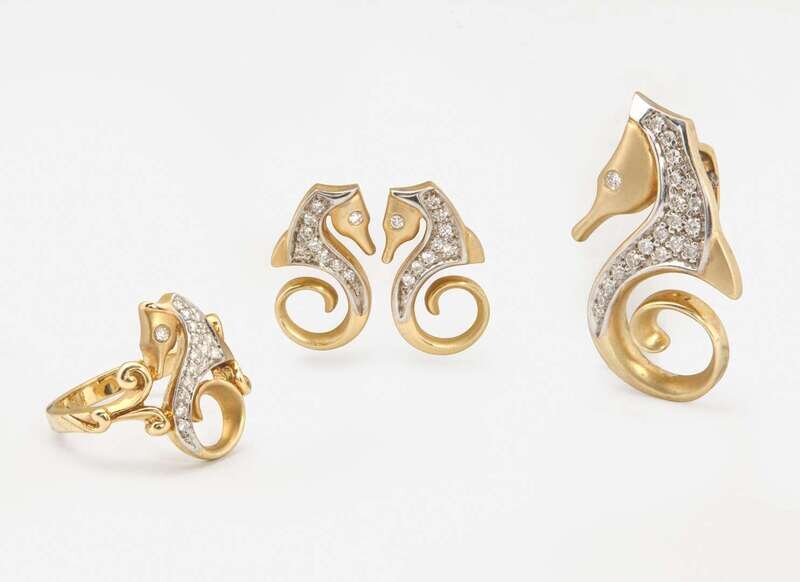 A suite of matching 14K yellow gold jewelry including a ring, a pair of earrings, and a pendant, each designed in a seahorse motif, and set with round brilliant-cut diamonds. Diamonds are near colorless (G – J), with SI – I clarity. Total estimated weight of diamonds: 0.75 carats.