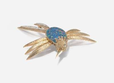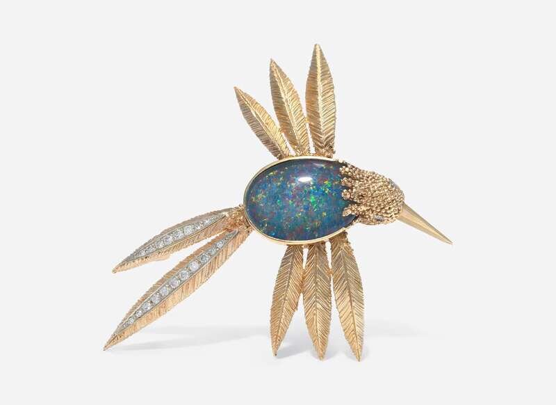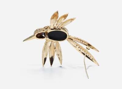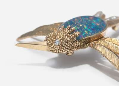 A 14K yellow gold pin designed as a hummingbird, with feathery wings from textured yellow gold, the tail feathers set with strips of graduated round brilliant-cut diamonds with an additional round brilliant-cut diamond set within the textured head of the bird as its eye, and the body of the hummingbird fashioned from an oval black opal triplet. Diamonds are near colorless (G - J), with VS - SI clarity. Total estimated weight of diamonds: 0.82 carats.
