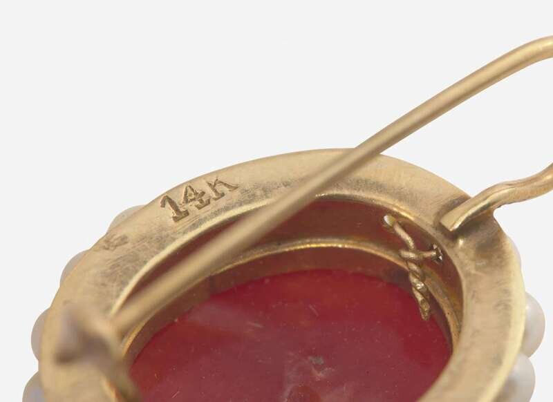 Oval Earrings: Light scratches and wear, stamped “14K”, set with two oval coral cabochon stones measuring approximately 10.00mmx 12.00mm, and thirty-six round white seed pearls each measuring approximately 2.40mm.