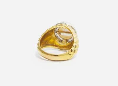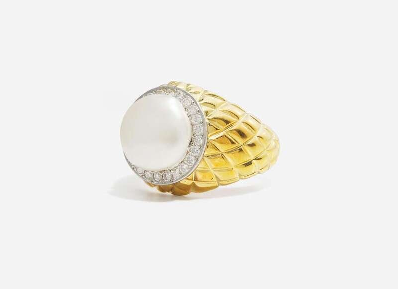 An 18K yellow gold ring with a gridded textured wide shank, centering a round white button pearl surrounded by a halo of round brilliant-cut diamonds set in white gold. Diamonds are near colorless (G – J), with SI – I clarity. Total estimated weight of diamonds: 0.24 carats.