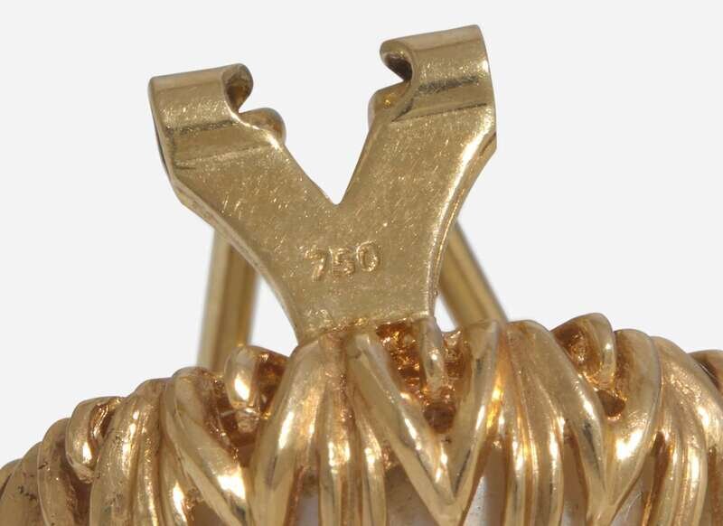 Pearl Ear Clips: Minor scratches and wear to metal, stamped “750”, omega clip backs in working order, set with two white mabé pearls each measuring approximately 16.30mm.