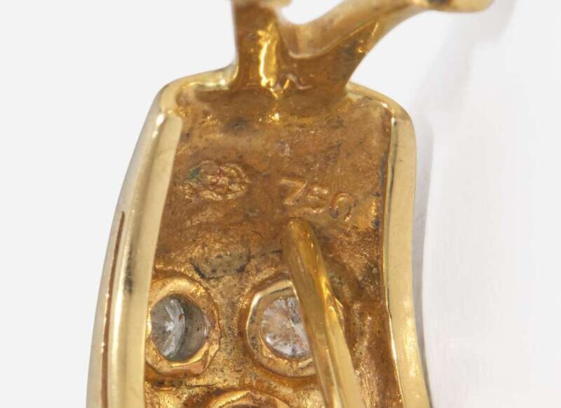 Sapphire Ear Clips: Some scratches and wear to metal, omega clip backs in working order, foldable posts in working order, stamped “750” with maker’s mark, set with two oval-cut sapphires each measuring approximately 2.94mm x 3.54mm, two pear-shape sapphires each measuring approximately 2.80mm x 4.08mm, two round-cut sapphires each measuring approximately 2.94mm, and ten round brilliant-cut diamonds each measuring approximately 2.20mm, near colorless (G – J), with VS – SI clarity. Total estimated weight of diamonds: 0.40 carats.