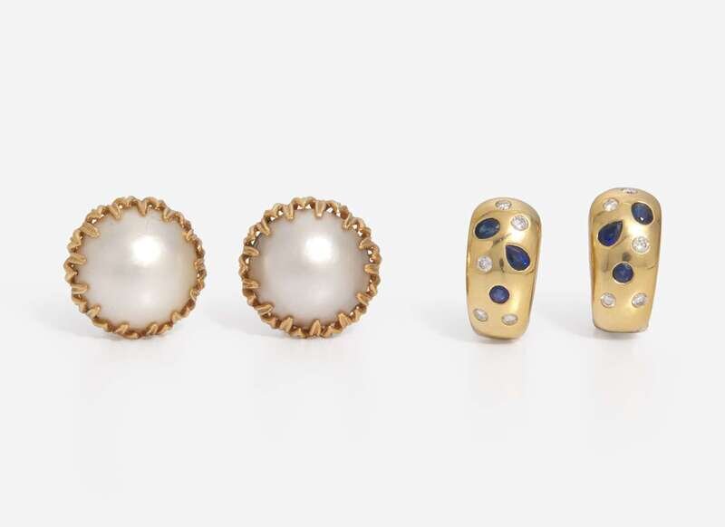 Two pairs of ear clips, including a pair of 18K yellow gold ear clips each featuring a white mabé pearl, and a pair of 18K yellow gold ear clips with a foldable post, set with pear-shape, oval-cut, and round-cut sapphires and round brilliant-cut diamond accents. Diamonds are near colorless (G – J), with VS – SI clarity. Total estimated weight of diamonds: 0.40 carats.
