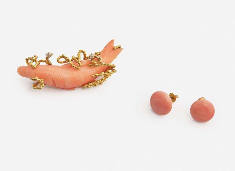 A 14K yellow gold brutalist brooch featuring a carved coral fish with rectangular Mazarine-cut diamond accents, and a matching pair of stud earrings suitable for pierced ears on stud posts with screw-down earring backs, each set with a coral button. Diamonds are near colorless (G – J), with SI – I clarity. Total estimated weight of diamonds: 0.10 carats.