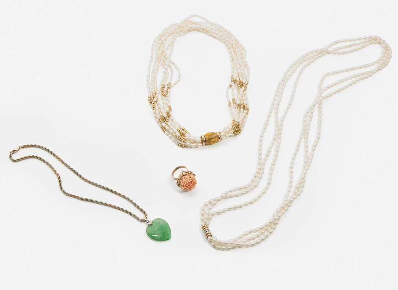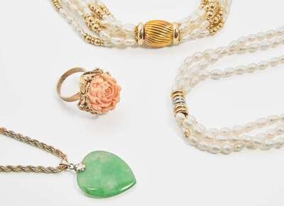 A miscellaneous collection of jewelry, including a 14K yellow gold torsade necklace strung with eight strands of keshi pearls with yellow gold bead accents, a 14K gold and keshi pearl three-strand necklace, an 18K yellow gold ring set with a carved coral rose, and a tri-color twisted rope chain with a jade pendant.