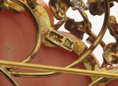 Coral Brooch: Significant scratches, wear, and discoloration, clasp in working order, stamped “14K N”, set with a carved coral rose measuring approximately 32.00mm x 36.40mm, and eight round brilliant-cut diamonds each measuring approximately 2.00mm, near colorless (G – J), with SI – I clarity. Total estimated weight of diamonds: 0.20 carats.