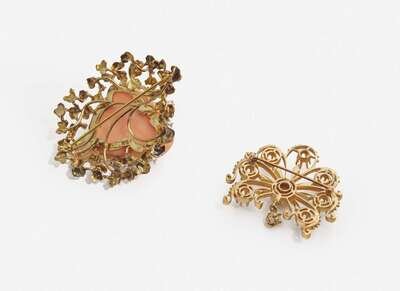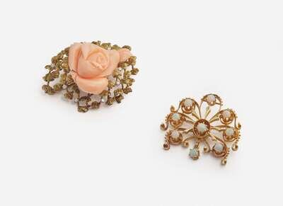 A yellow gold brooch designed in an openwork style and set with round cabochon opals, together with a 14K yellow gold brooch featuring a carved coral rose surrounded by sections of textured yellow gold petals and round brilliant-cut diamond accents. Diamonds are near colorless (G – J), with SI – I clarity. Total estimated weight of diamonds: 0.20 carats.