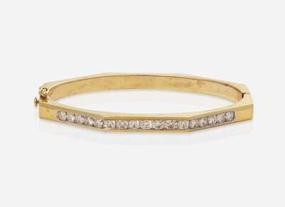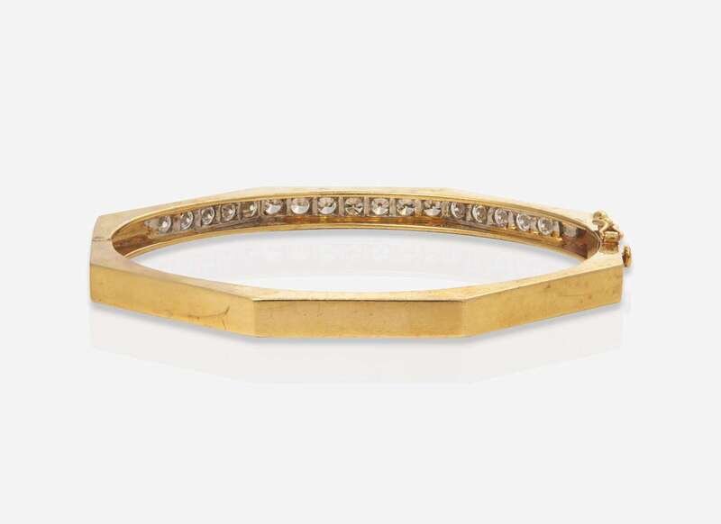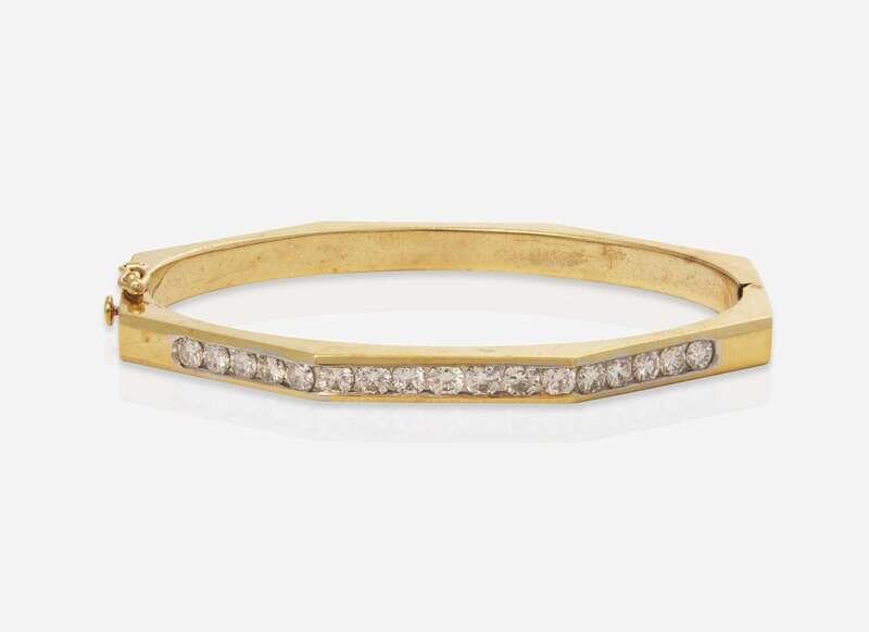 A geometric bangle bracelet, designed as an octagonal bangle on a hinge opener crafted from 14K yellow gold, with a row of round brilliant-cut diamonds channel-set along the top of the bracelet. Diamonds are near colorless (G – J), with VS – SI clarity. Total estimated weight of diamonds: 2.00 carats.
