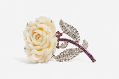 An 8K white gold brooch designed as a flower, set with a carved coral shaped as a rose, on a stem set with calibre-cut rubies, with white gold leaves set with straight baguette-cut diamonds, with marquise-cut diamond and round-cut ruby accents. Diamonds are near colorless to faint color (G – K), with SI – I clarity. Total estimated weight of diamonds: 1.20 carats.