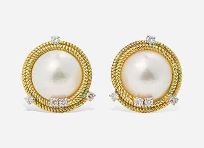 A pair of 18K yellow gold ear clips, suitable for non-pierced ears, featuring round white mabé pearls enclosed in a spiral of textured yellow gold, with round brilliant-cut diamond accents. Diamonds are near colorless (G – J), with SI – I clarity. Total estimated weight of diamonds: 0.70 carats.