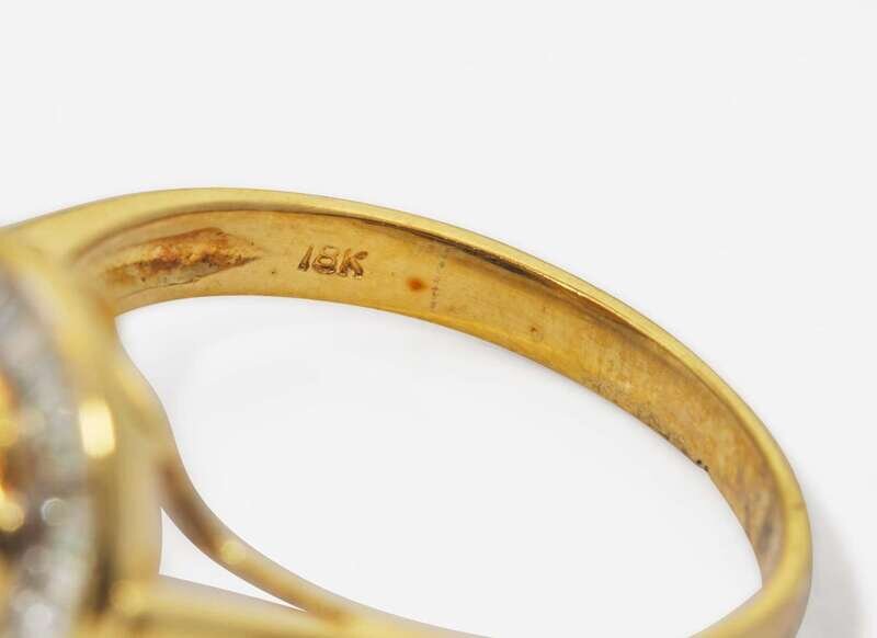 Ring: Minor wear, stamped “18K”, set with one pear-shape jade measuring approximately 6.80mm x 9.30mm, and numerous baguette-cut diamonds each measuring approximately 0.75mm x 1.55mm, near colorless (G – J), with SI – I clarity. Total estimated weight of diamonds: 0.47 carats.