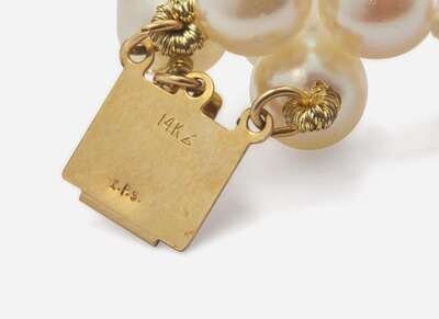 Bracelet: Minor wear, stamped “14KG L.R.S.”, box clasp in working order, set with ninety round white pearls with pinkish overtone each measuring approximately 5.95mm.
