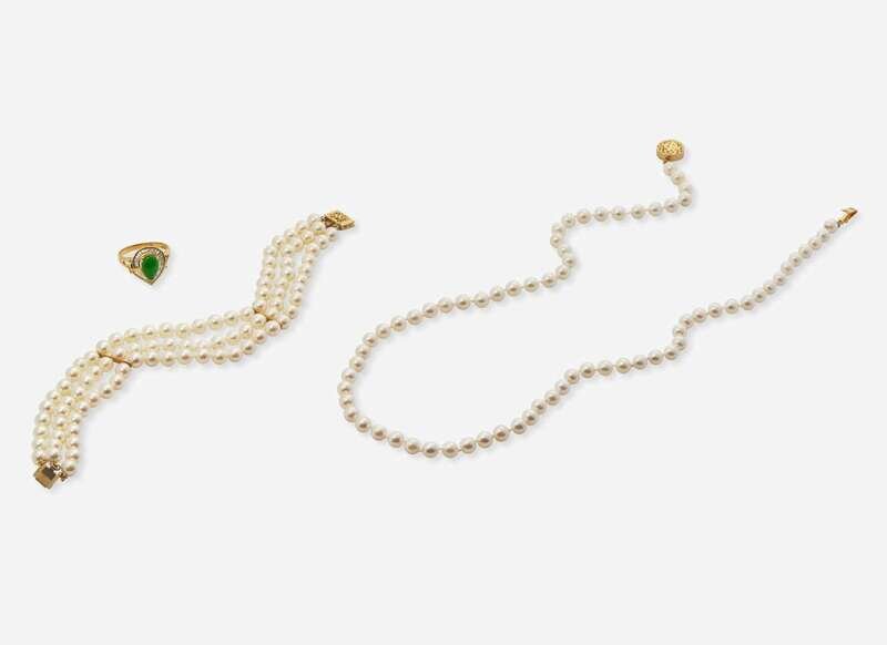 A collection of gold and organic gemstone jewelry, including a strand of round white pearls with pinkish overtone completed with a 14K yellow gold clasp, a three-strand pearl bracelet strung with round white pearls and completed by a 14K yellow gold clasp, and an 18K yellow gold ring set with a pear-shape jade surrounded by a swirl of tapered baguette-cut diamonds. Diamonds are near colorless (G – J), with SI – I clarity. Total estimated weight of diamonds: 0.47 carats.