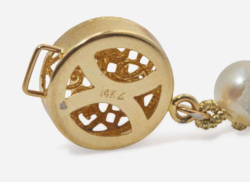 Necklace: Minor wear, stamped “14KG”, clasp in working order, set with seventy-one round white pearls with pinkish overtone each measuring approximately 5.90mm.