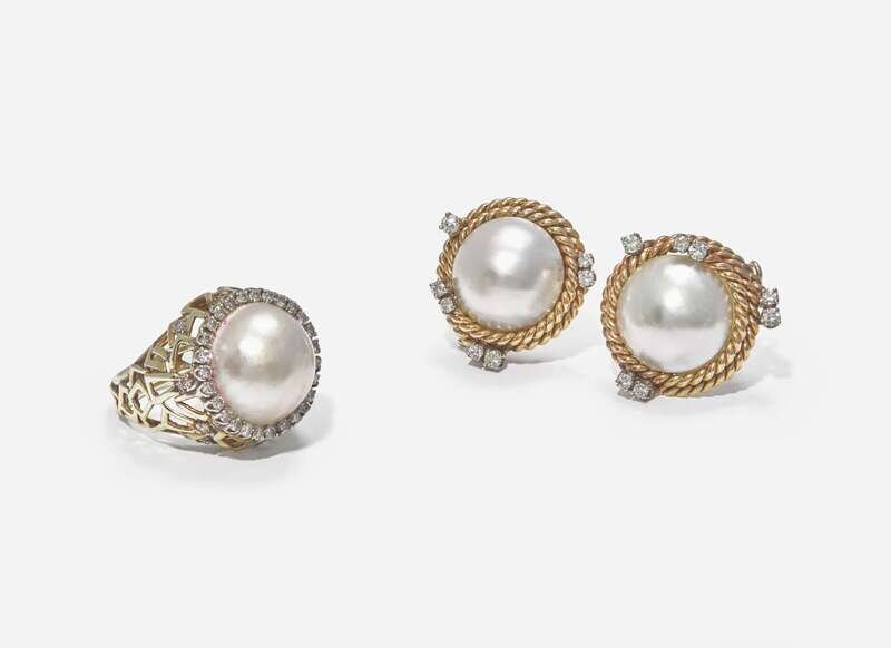 A set of 14K yellow gold and pearl jewelry, including a pair of 14K yellow gold ear clips designed as twists of 14K yellow gold coiling themselves around mabé pearls each measuring approximately 16.67mm and accented by round brilliant-cut diamonds, and a modern geometrical openwork ring centering a mabé pearl measuring approximately 16.60mm surrounded by a halo of single-cut and round brilliant-cut diamonds, with further diamond accents within the shank. Diamonds are near colorless (G – J), with SI – I clarity. Total estimated weight of diamonds: 1.10 carats.