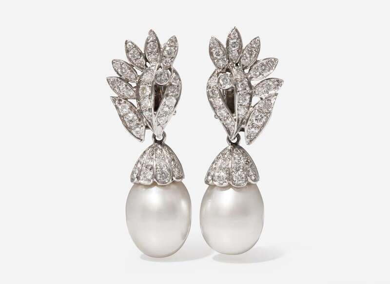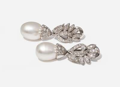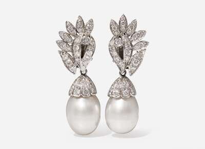 A pair of 14K white gold earrings, suitable for pierced ears on stud posts with omega clip backs, designed as asymmetrical fronds set with round brilliant-cut diamonds, with removable drops featuring prominent white South Sea drop pearls further accented by round brilliant-cut diamonds. Diamonds are near colorless (G – J), with SI – I clarity. Total estimated weight of diamonds: 1.30 carats.