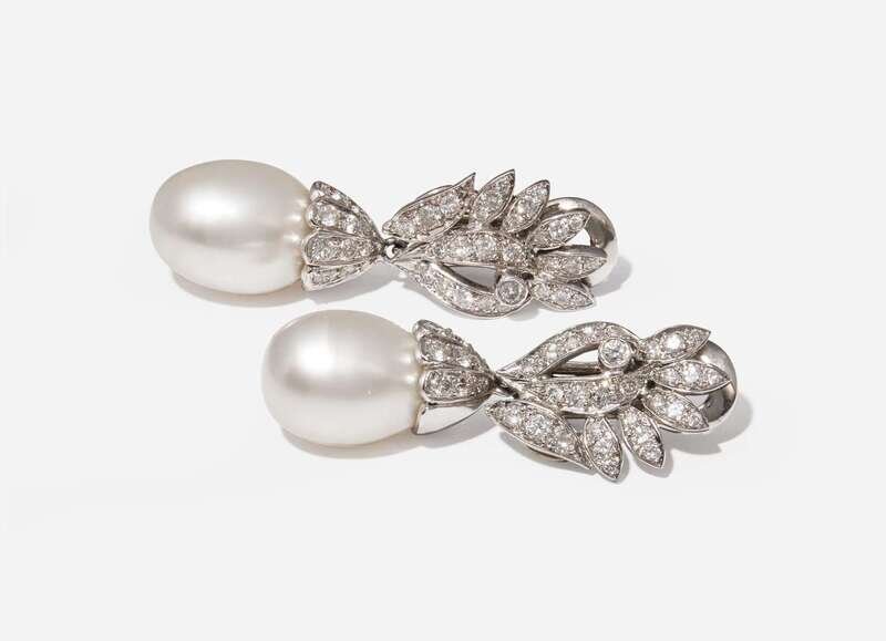 Pearls: Two white South Sea drop pearls each measuring approximately 12.50mm x 17.50mm, with some pits to both pearls.